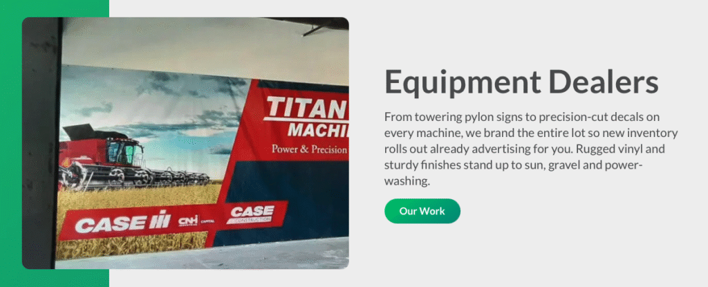 Equipment Dealer Solutions Machine Branding Machine Branding Sign Badgers delivers bold machine branding that highlights your dealership and ensures every piece of equipment stands out in the field or on the lot. Experience Marketing Experience Marketing We create immersive marketing displays that bring your brand to life, helping dealers connect with customers through memorable, hands-on […]