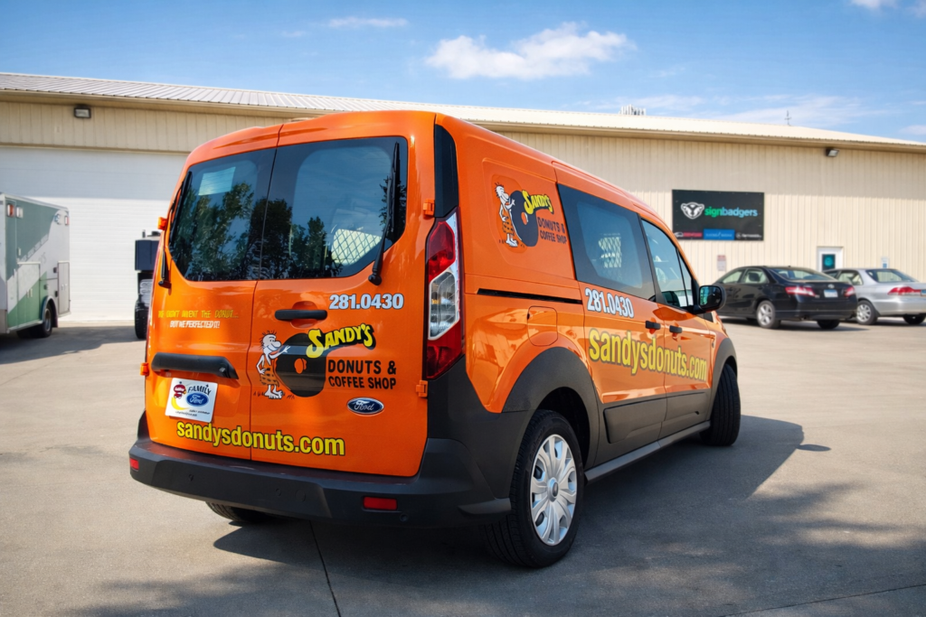 Beyond core menu and product signage, Sign Badgers has delivered a variety of experiential and promotional applications, including large exterior wall murals, window vinyl graphics, parking signage, and branded donut case displays within convenience store locations. Vehicle wraps for delivery vehicles and trade show materials further extend the brand across delivery and wholesale channels, creating a consistent presence across every touchpoint.