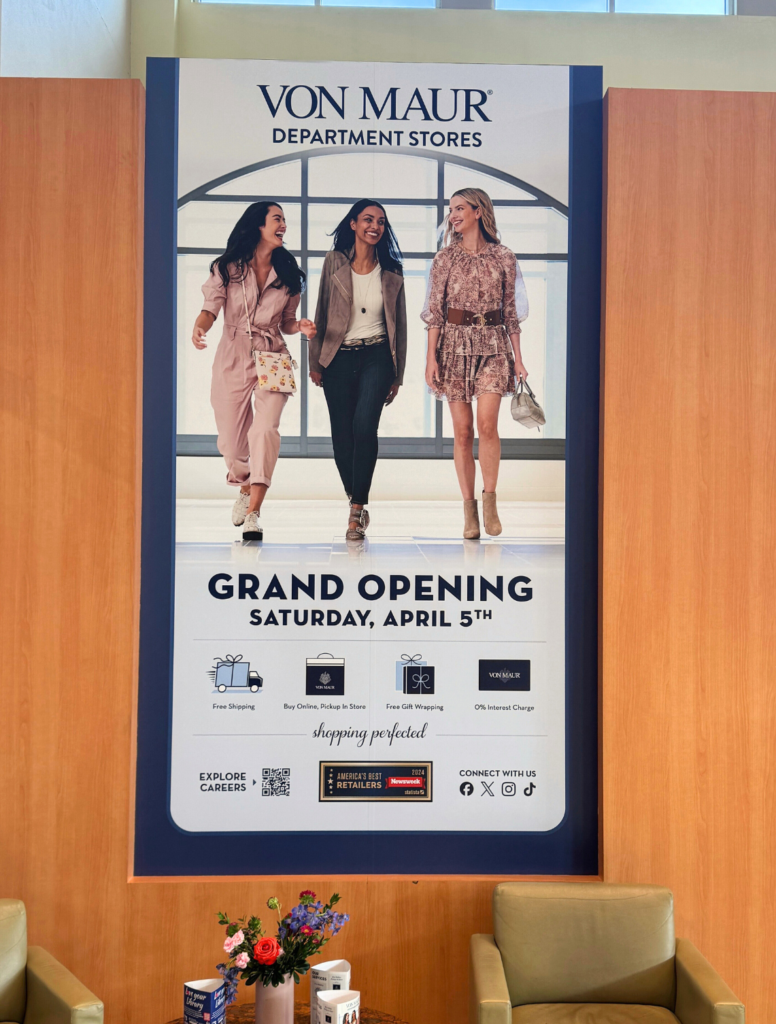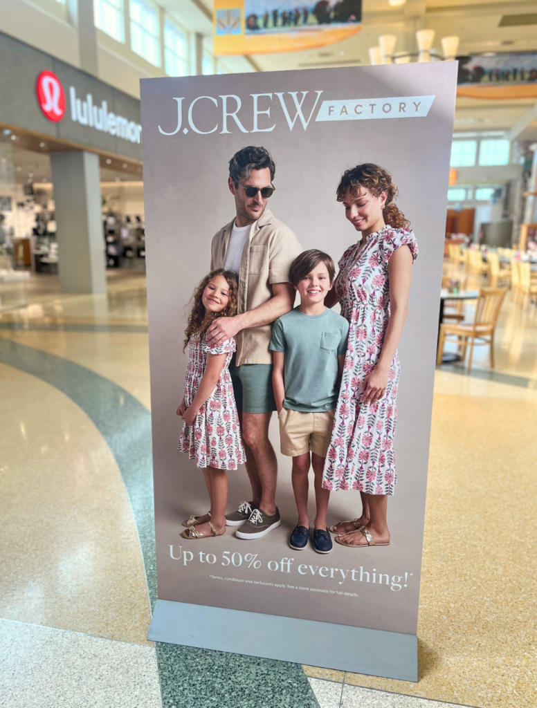 Throughout the interior and exterior spaces, Sign Badgers has delivered a mix of functional and experiential elements, including large-scale murals and artwork wraps, custom flooring graphics guiding guests to seasonal destinations, and barricade wraps announcing upcoming store openings. In addition, promotional signage such as door clings, table tents, floor standees, and A-frames allows West Acres to highlight sales, events, and tenant campaigns without sacrificing visual consistency.